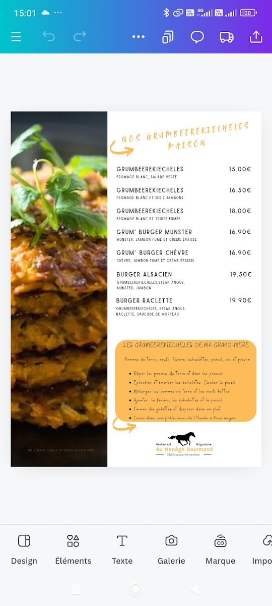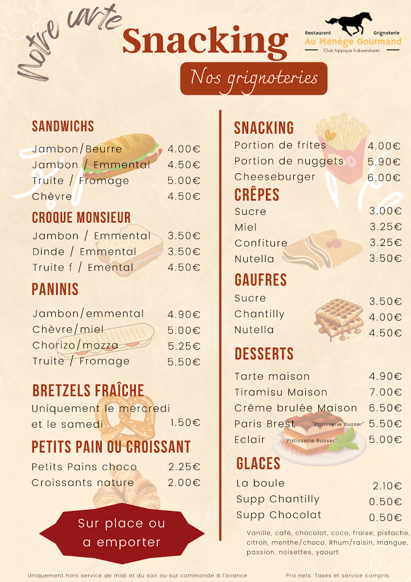 Welcome to Au Manege Gourmand, a delightful culinary oasis in Eckwersheim, France. This charming restaurant invites you to indulge in a menu that beautifully balances tradition and innovation. Starters like tapass offer crispy onion rings and savory cheese bites, perfect for sharing. For heartier options, their signature Grumbeerekiecheles showcase local specialties, with delectable burgers featuring Angus steak and regional cheeses like Munster. Each dish is crafted with fresh, homemade ingredients, ensuring a memorable dining experience.